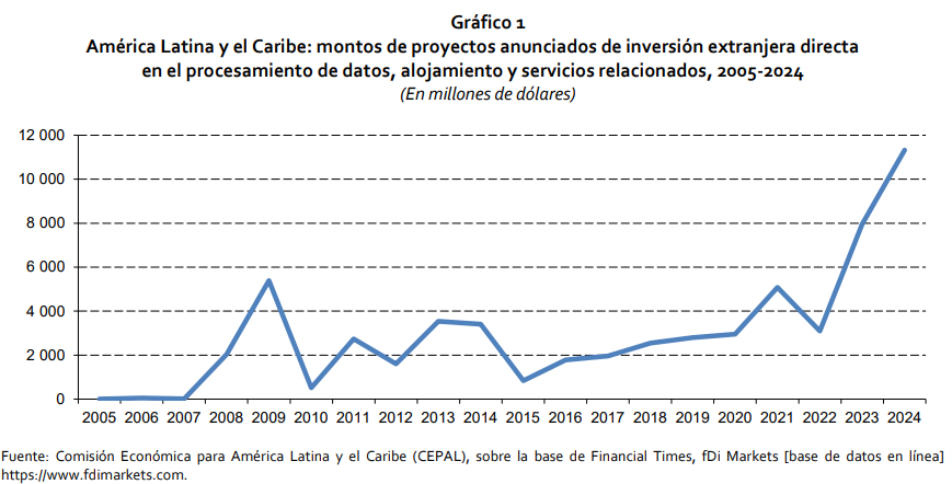 ¿A qué responde esta inusitada inversión de centros de datos en América Latina y cuáles son los retos que representa? Un documento reciente de la Comisión Económica para América Latina y el Caribe (CEPAL) que no es exactamente sobre centros de datos pero que sí analiza la inversión extranjera directa (IED) digital, puede dar más antecedentes. El informe se llama «La inversión extranjera directa digital en América Latina y el Caribe. Oportunidades y desafíos» (2025) y la autoría es de Nikolas Passos y Andrea Laplane.
