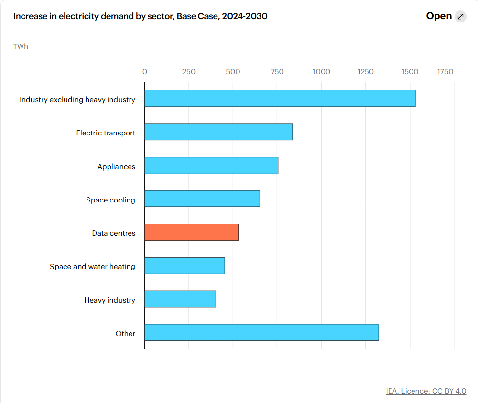 Nevertheless, in the same report, the IEA states that, despite the sharp increase, the growth in electricity demand from data centers accounts for less than 10% of global electricity demand growth between 2024 and 2030 in the baseline scenario. Other key factors, such as growth in industrial production and electrification, the deployment of electric vehicles, and the adoption of air conditioning, lead the way.