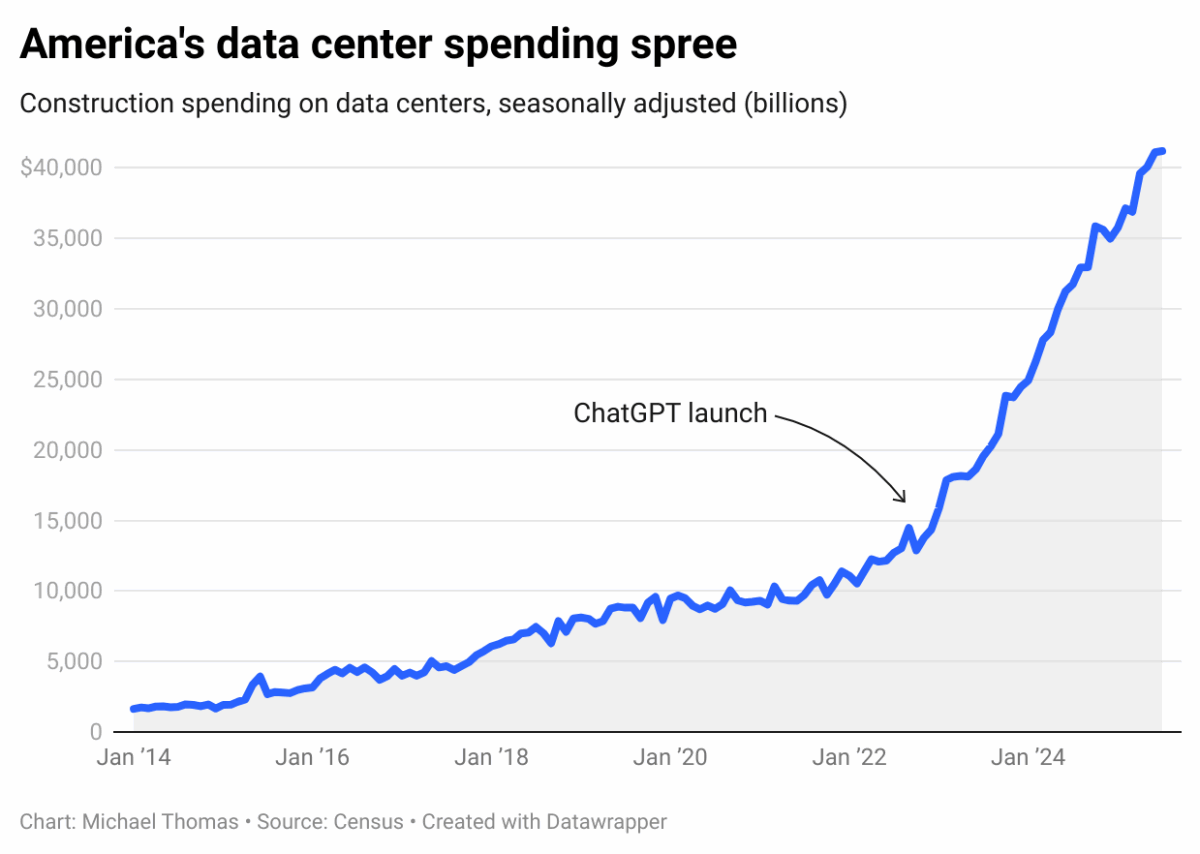 However, since the launch of ChatGPT in November 2022, technology companies have invested heavily in building data centers. As Michael Thomas (2025) reports, in just three years, spending on data centers in the United States has risen from $13.8 billion to $41.2 billion per year, an increase of 200%. This has occurred at a time when virtually all other construction activity in the country has slowed.