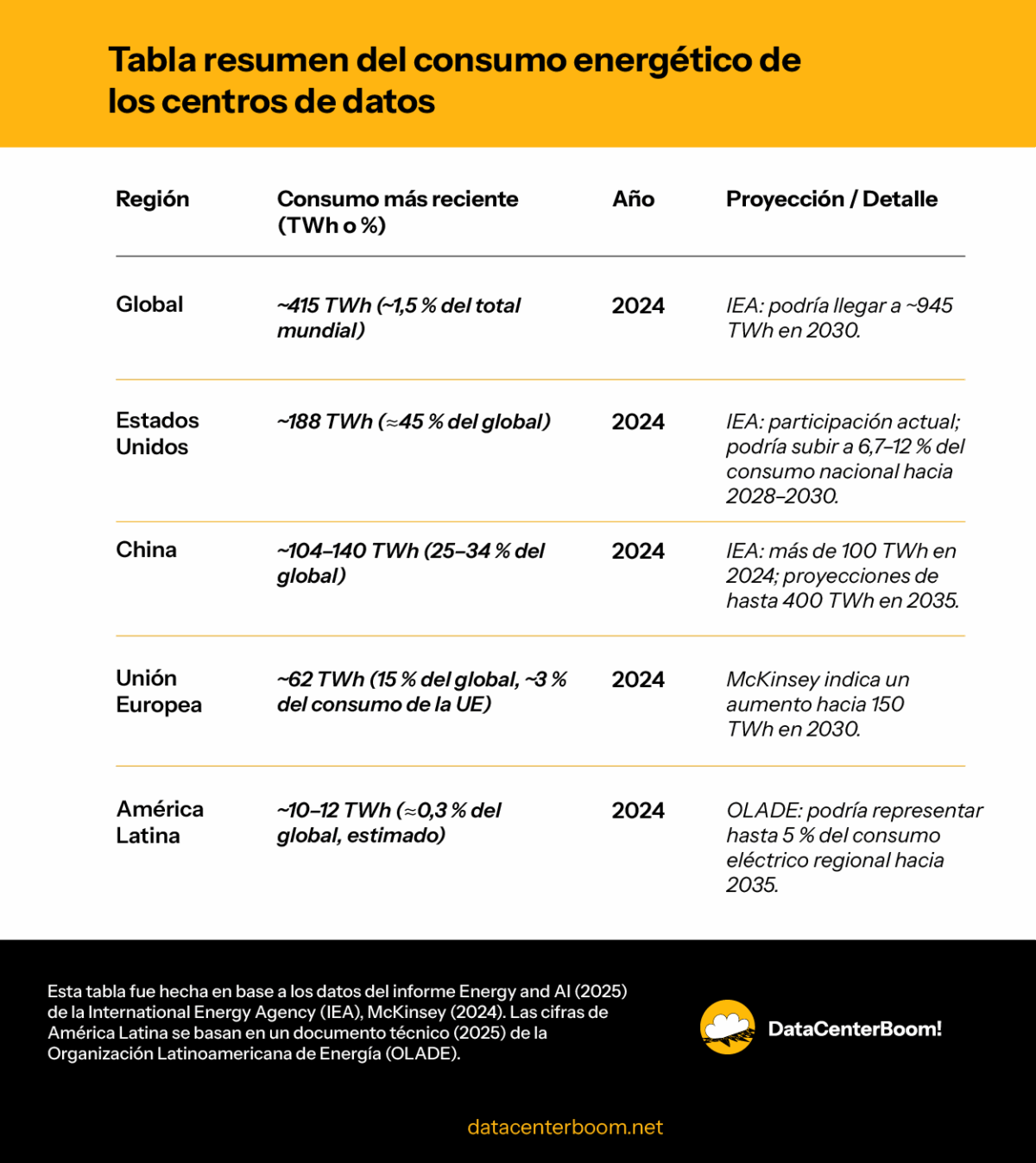 - Los centros de datos representaron alrededor del 1,5% del consumo mundial de electricidad en 2024, es decir, 415 teravatios-hora (TWh).