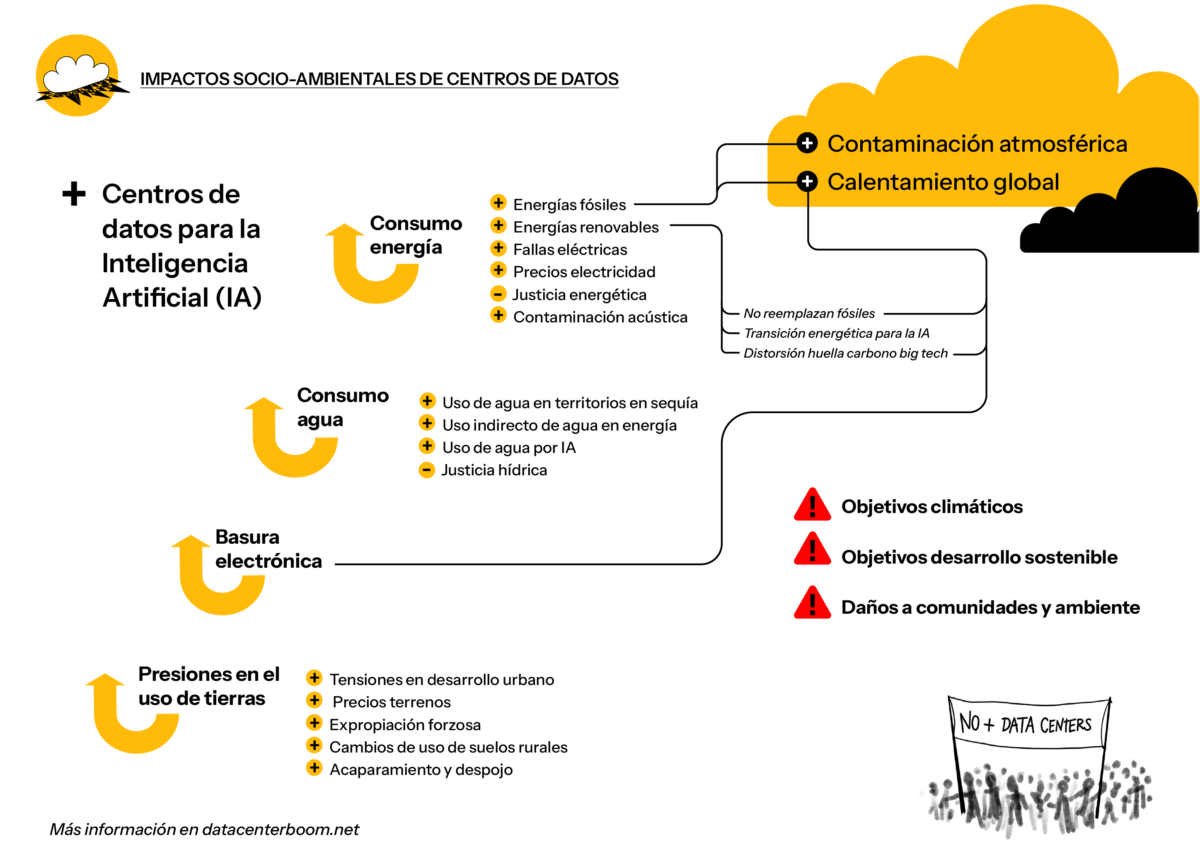 Mientras los centros de datos se multiplican, la polémica por sus profundas consecuencias socio-ambientales aumenta en todo el mundo. En América Latina, sus impactos tienen matices distintos que resuenan con desafíos históricos. Te presentamos un catálogo de impactos detrás de “la nube” para comprender los conflictos socio-ambientales en tu comunidad.